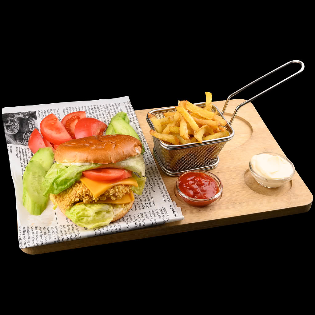 Лева ЕвроХрупкав пилешки бургер с пържени картофи