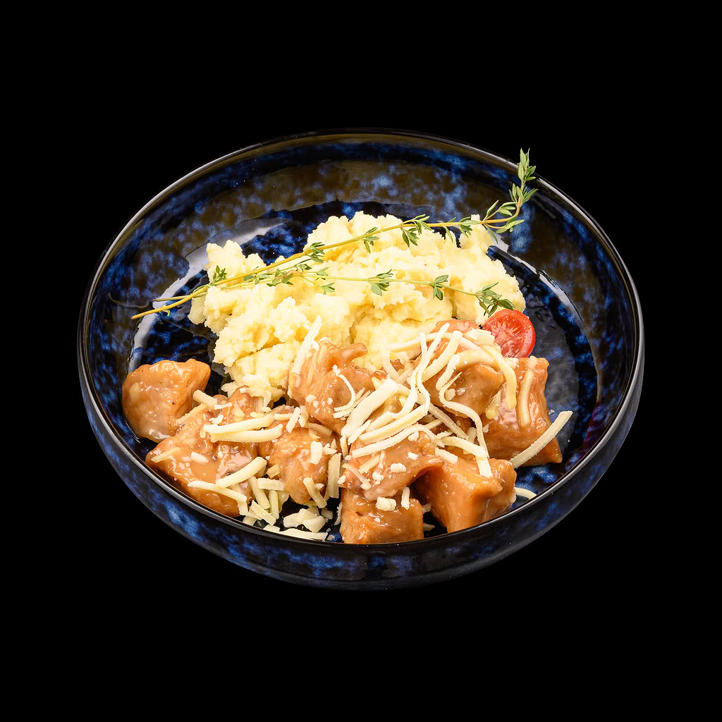 Глазирани пилешки късчета с картофено пюре