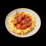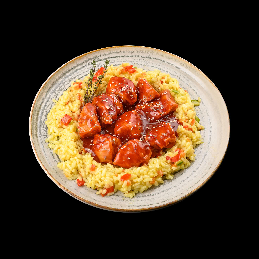 пилешко филе,ориз, червена чушка, тиквичка, сусам, сладко-кисел сос 350гр.