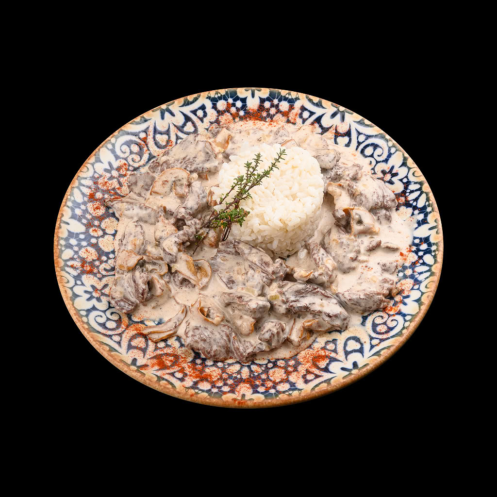 телешко бон филе, лук, гъби, сметанов сос, ориз 350гр.