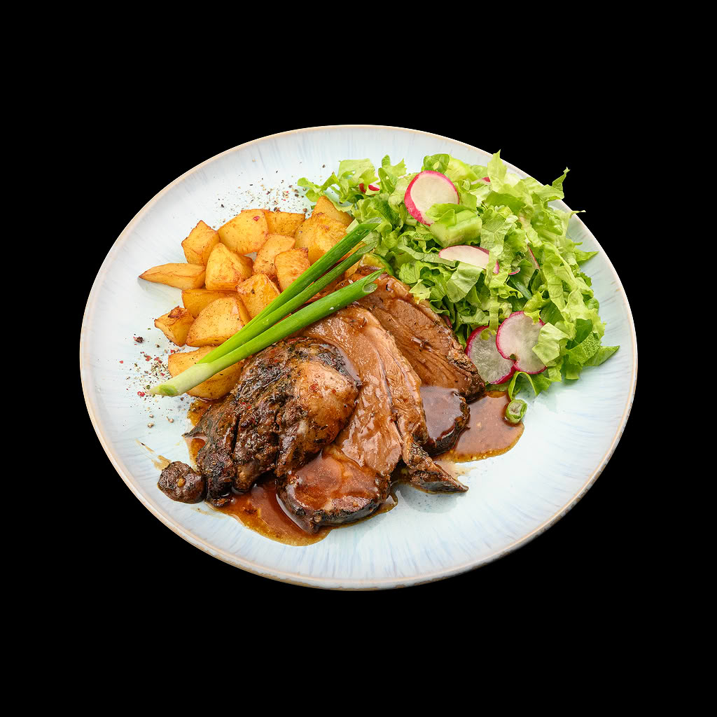 Агнешко печено със зелена салата и сотиран картоф