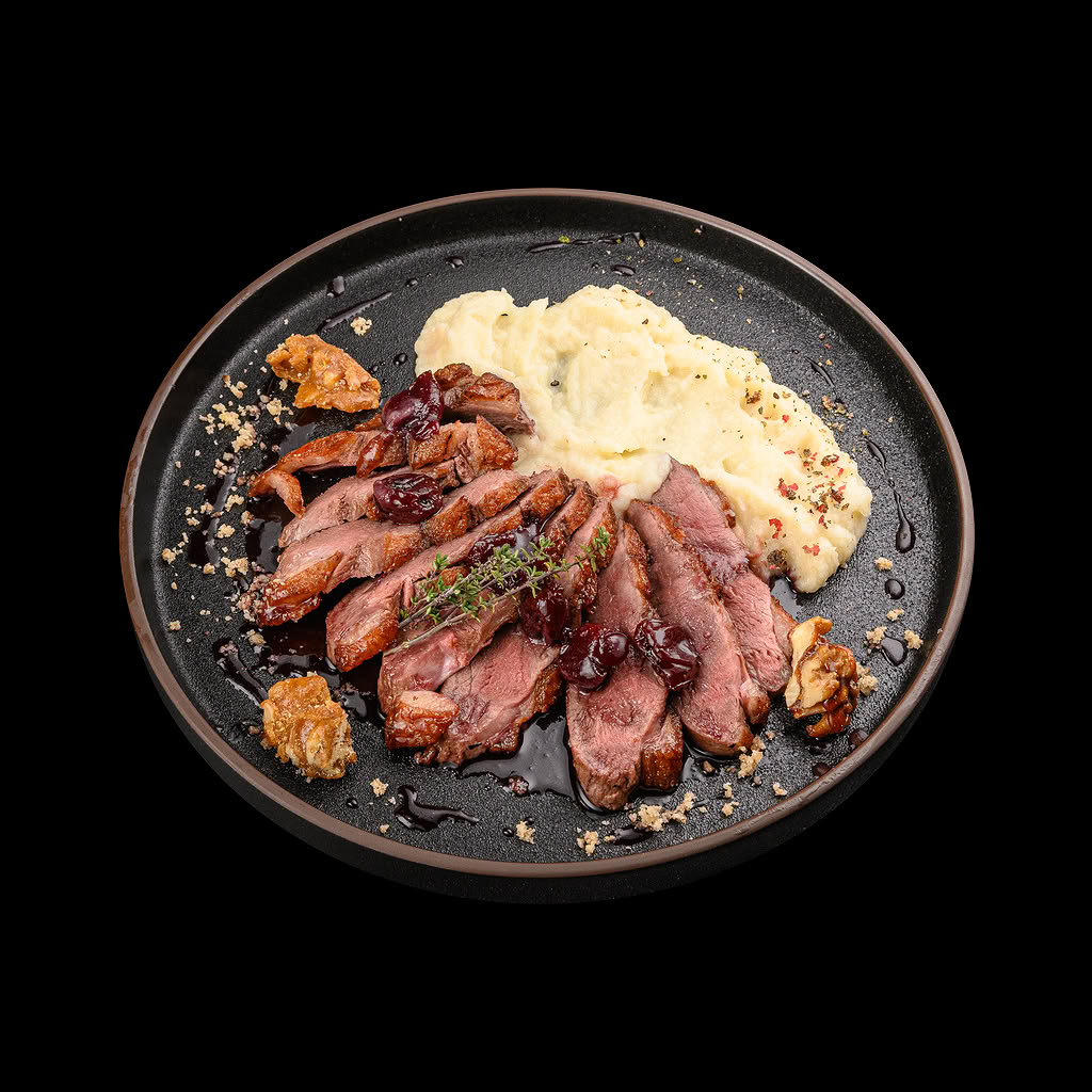 Патешко магре с пюре от целина и сладко от вишни