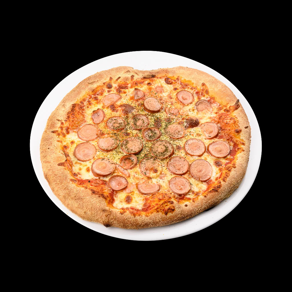 домашно заквасено тесто, домашен доматен сос, моцарела, кашкавал, кренвирш, чубрица 420гр.