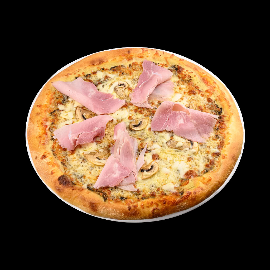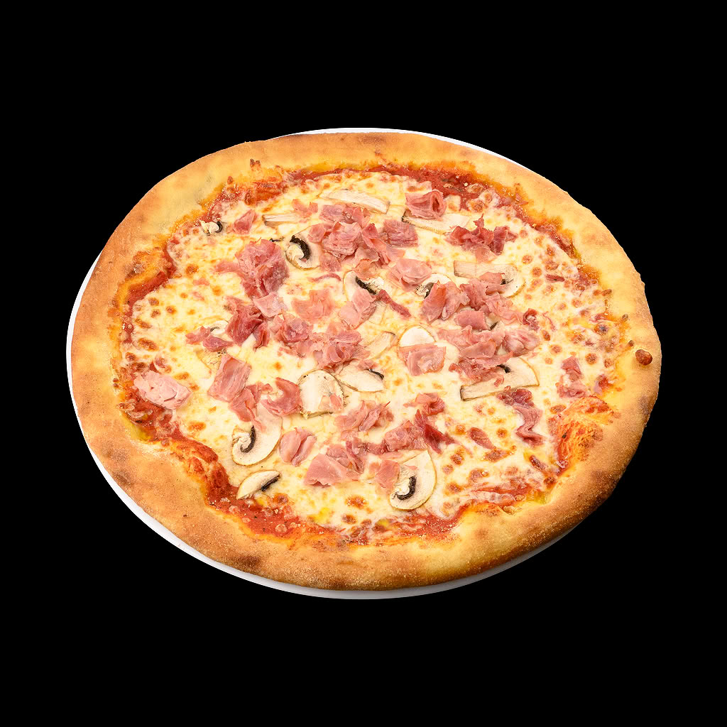 домашно заквасено тесто, домашен доматен сос, моцарела, кашкавал, шунка, гъба печурка, риган 420гр.