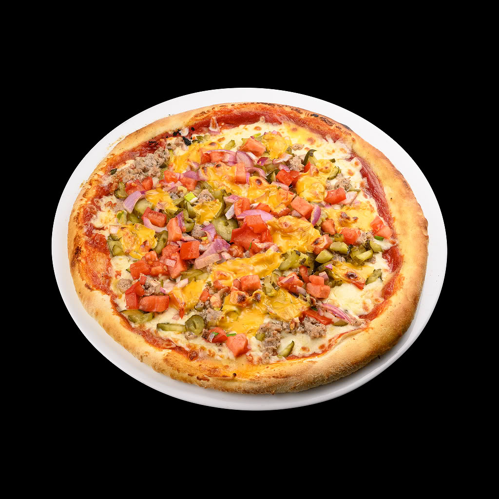 домашно заквасено тесто, кетчуп, чедър, кашкавал, зехтин, мляно телешко месо, горчица, червен лук, кисела краставичка, домати 420гр.