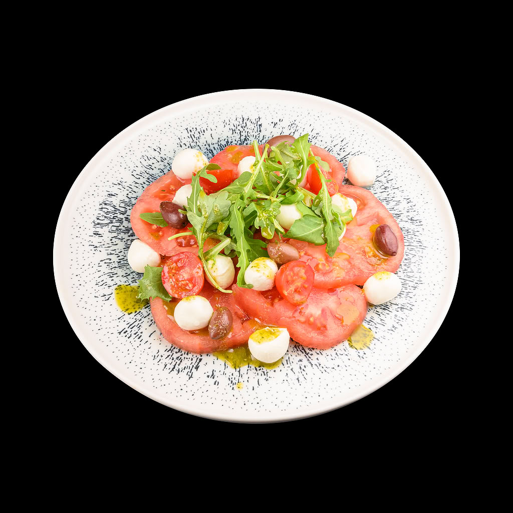 домат, моцарела, маслини, кедрови ядки, песто дженовезе / босилек, кедрова ядка, памезан, лимон, зехтин, сол/ 400гр.