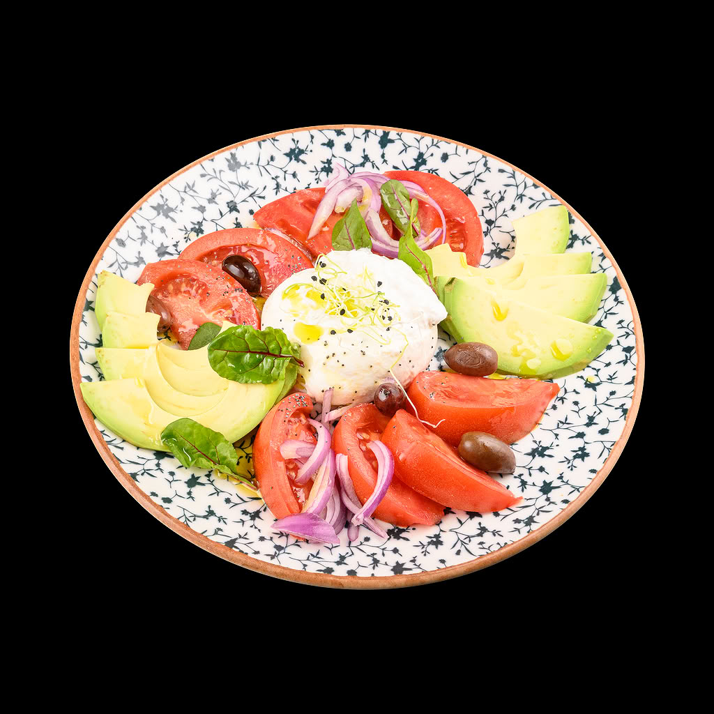 домат, бурата, моцарела, маслини, кедрови ядки, песто дженовезе, авокадо / босилек, кедрова ядка, памезан, лимон, зехтин, сол/ 400гр.